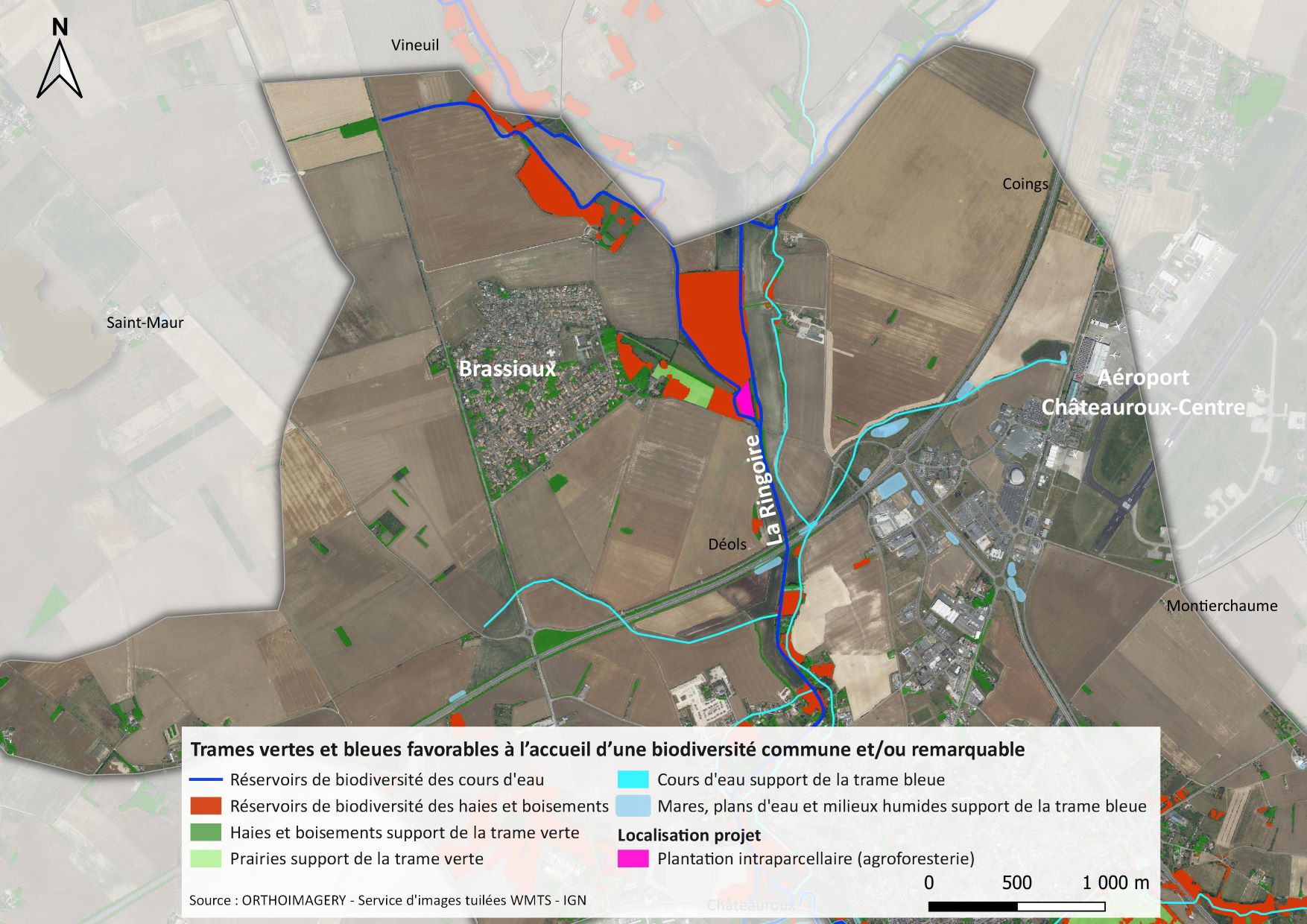 La Champagne Berrichonne s’exprime pleinement dans ce secteur d’openfield (champ ouvert) ponctué ici et là de quelques boisements et mardelles. Les haies sont relativement peu présentes et discontinues. L’Angolin, affluent de la Ringoire, constitue la principale zone de refuge pour la biodiversité avec des boisements alluviaux qui s’étendent de part et d’autre du cours d’eau. La création de nouvelles haies bocagères offre une bonne opportunité pour favoriser l’accueil de la faune et lui permettre de transiter en toute sécurité au sein et entre les parcelles de grandes cultures. La plantation ne doit pas s’inscrire uniquement de manière isolée dans le paysage. Elle doit permettre la connexion avec les boisements et les mardelles et consolider les haies existantes pour créer des trames écologiques fonctionnelles.
