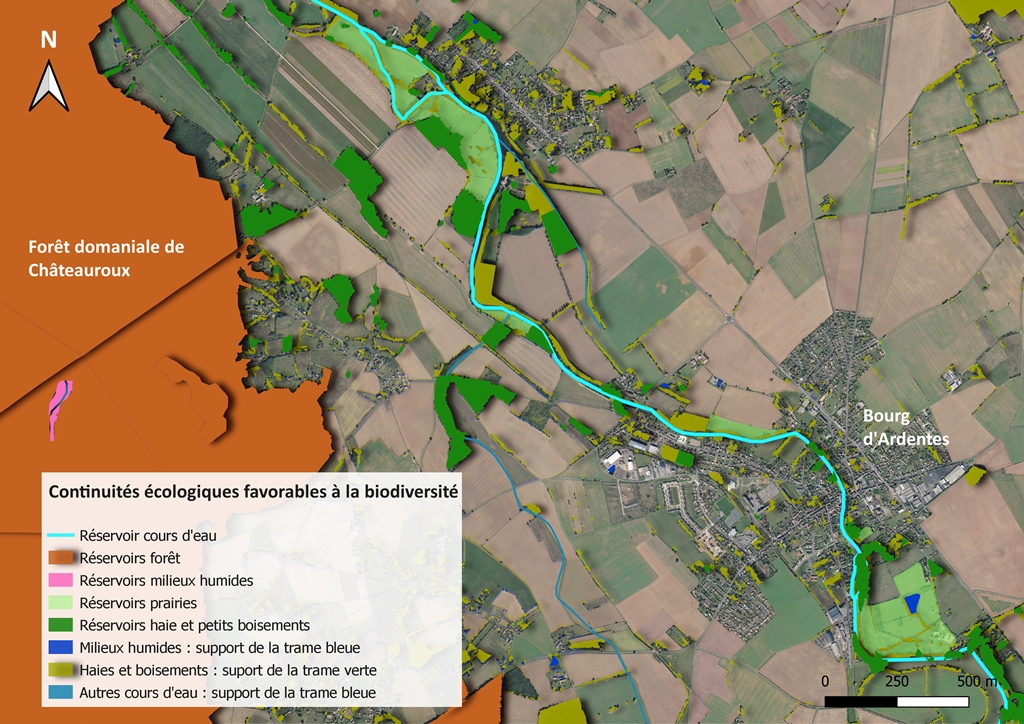 Le Val de l’Indre s’inscrit ici dans un contexte largement urbain par la présence du centre-bourg d’Ardentes, de ses activités et des différentes zones d’habitations qui gravitent autour. Les zones de prairies sont dominantes, mais de petites trames écologiques (bosquets, boisements et haies bocagères) sont malgré tout présentes majoritairement de part et d’autre de la rivière. Il est important de développer ces entités dans un contexte d’accroissement des phénomènes d’îlot de chaleur afin d'améliorer la qualité de vie de la population et d'offrir une nouvelle zone de refuge pour les espèces communes (oiseaux des villes, insectes, rongeurs).